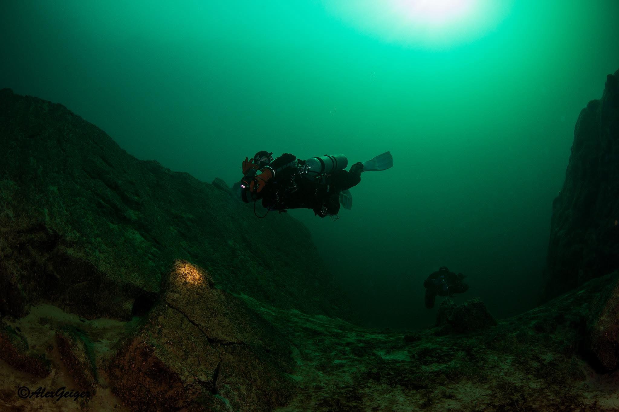 Unterwasser-Wiese: Linker Hand bleibt dieser Tauchplatz relativ flach und ist daher auch für Anfänger gut geeignet. Vor allem, weil es in den ausgedehnten Unterwasserwiesen zahlreiche Fische zu sehen gibt. Neben den Barschen, Rotaugen und Hechten kann man in der Nacht hier auch Aale beobachten.