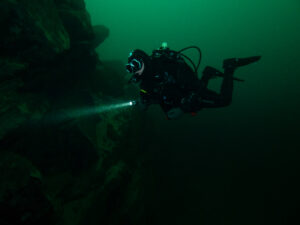 Folgt man der Leine links hinten, trifft man nach wenigen Metern auf die „Titanic“, die im Attersee leider nicht über die Größe eines Ruderbootes hinausgekommen ist. Taucht man der Steilwand weiter entlang, geht diese bald in eine schräg abfallende Schlammfläche über. Hier steigt man am besten höher und taucht entlang der Oberkante der Wand zurück.